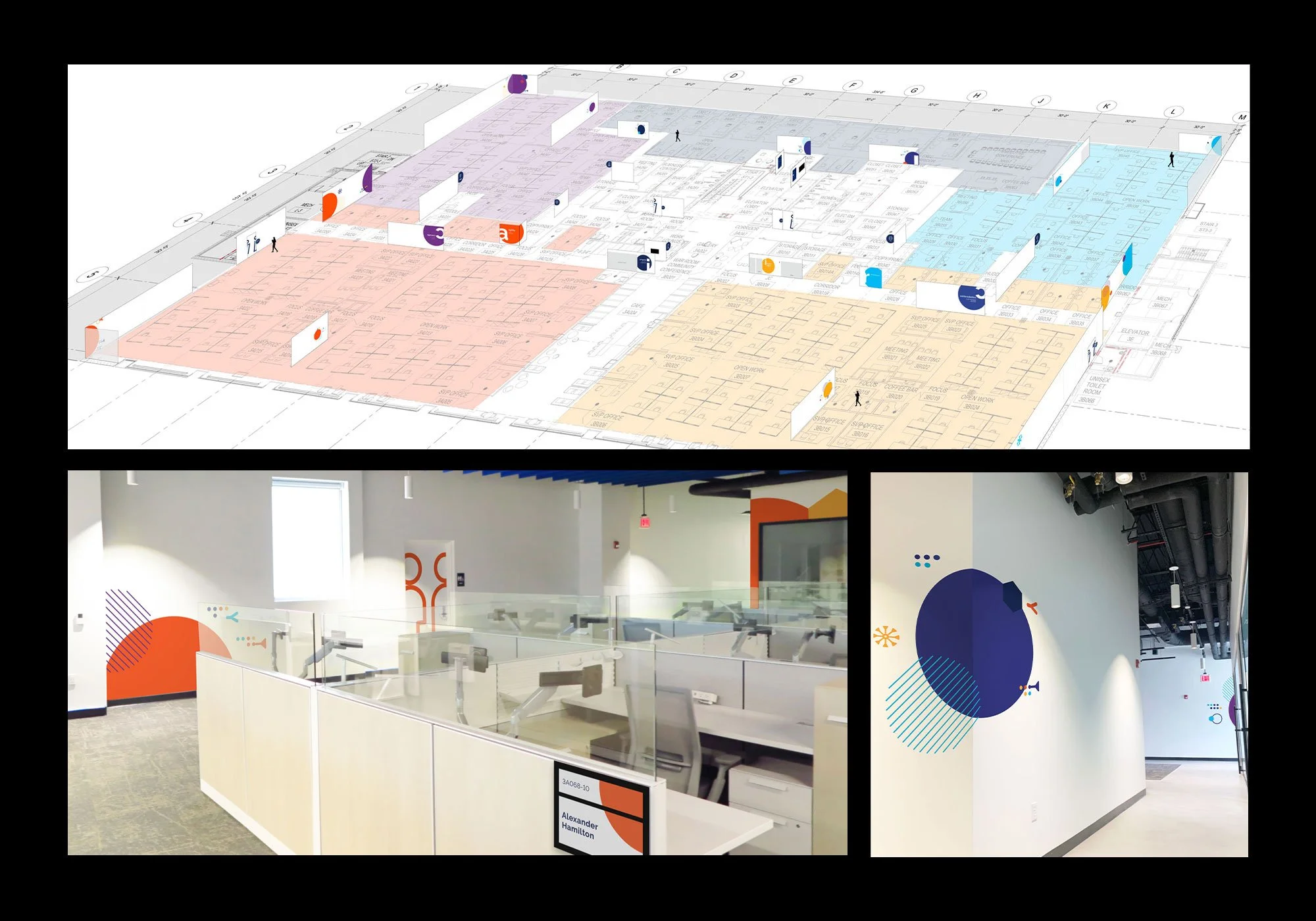 We developed a strategy-first identity system: bold typography, a modern color palette, and an iconography system focused on innovation and trust. We designed a wayfinding system across campuses and offices globally.
